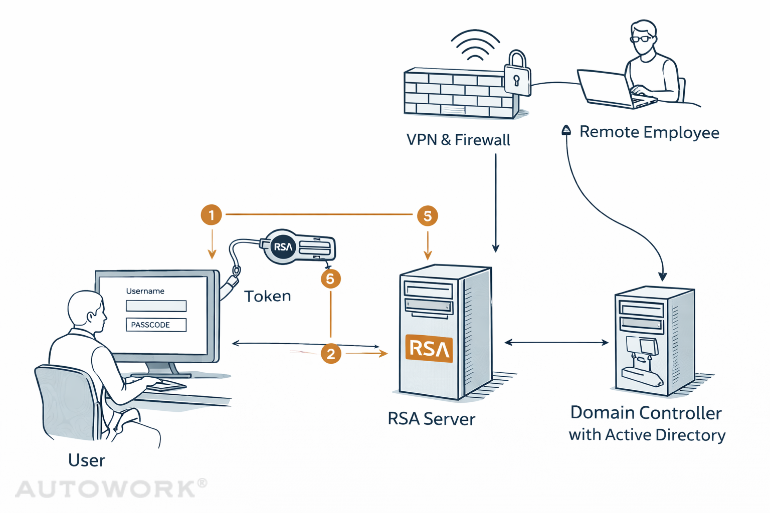 Die Firewall bzw. das VPN-Gateway leitet die Anfrage an den RSA Server weiter, der die Multi-Faktor-Authentifizierung überprüft. Erst nach erfolgreicher Prüfung wird der VPN-Tunnel aufgebaut und der Zugriff auf interne Ressourcen ermöglicht.